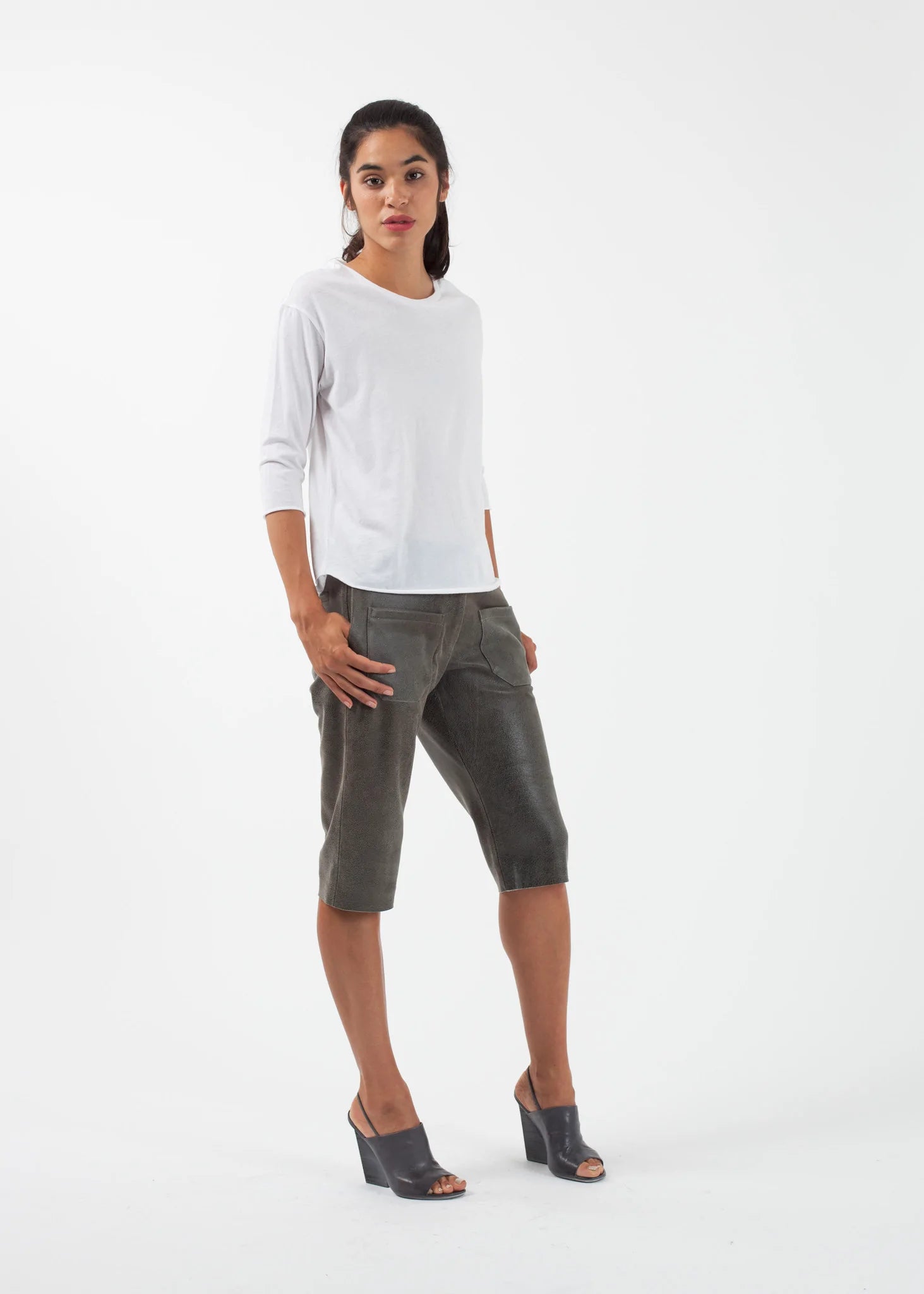 The Leather Cut-Off from Harvey Faircloth is an all-around winner. Zip fly with single button closure at front. Four exterior pockets. Raw hemming. 100% Leather, Lining 100% Cotton. Made in U.S.A. Ashley is wearing a US 2.