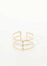 This gold and brass cuff is composed of 3 architectural three tiers, each bearing its small clear stone. 5 Octobre. Color Gold Brass. Length 6", 1.5" Wide.